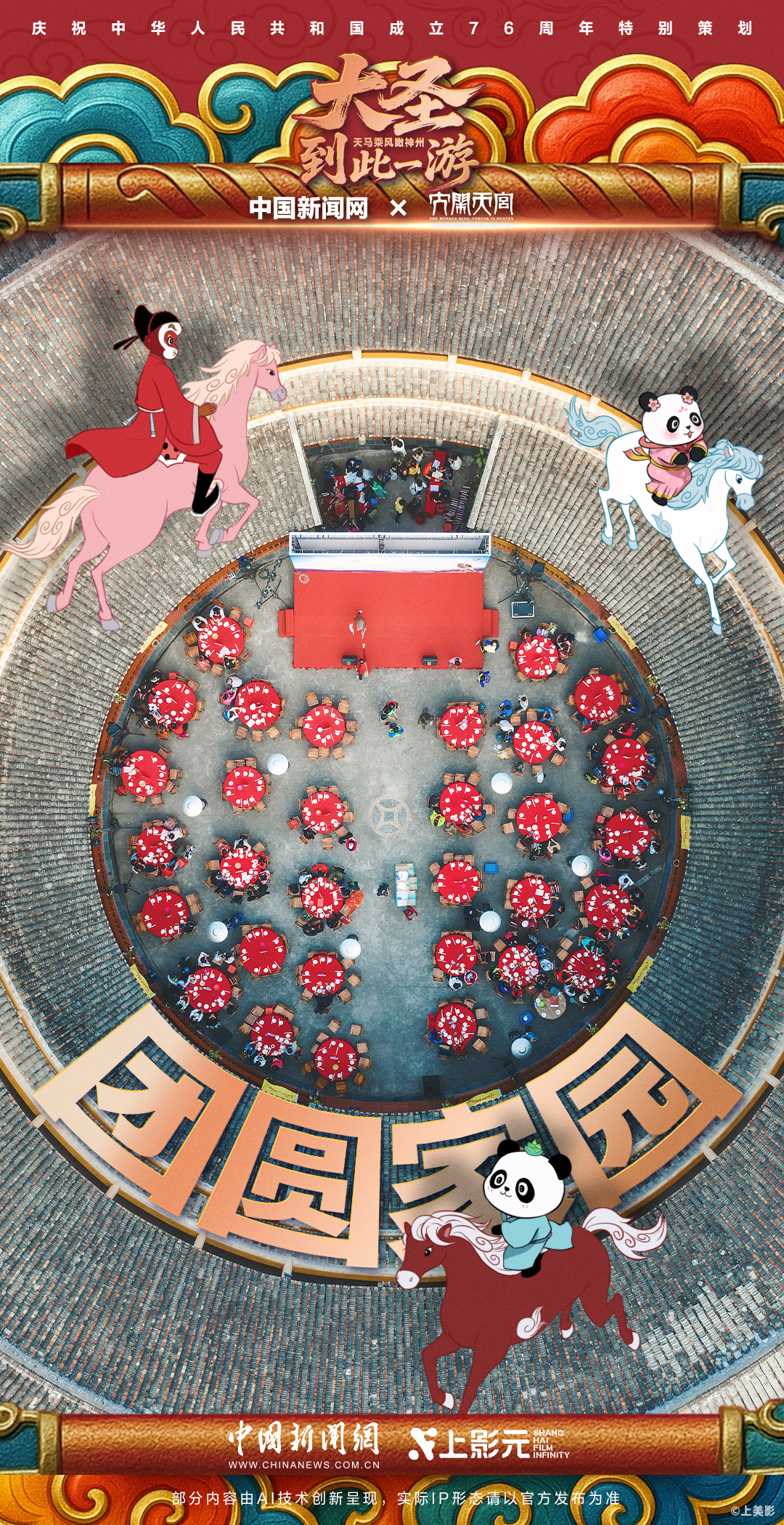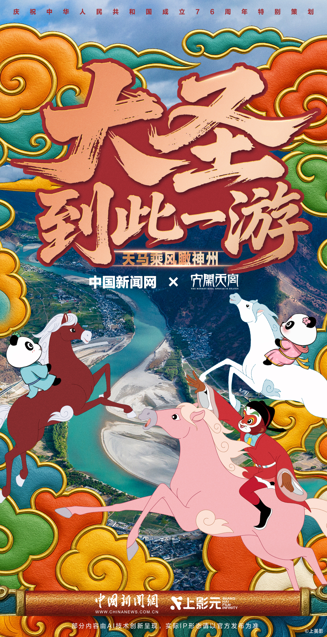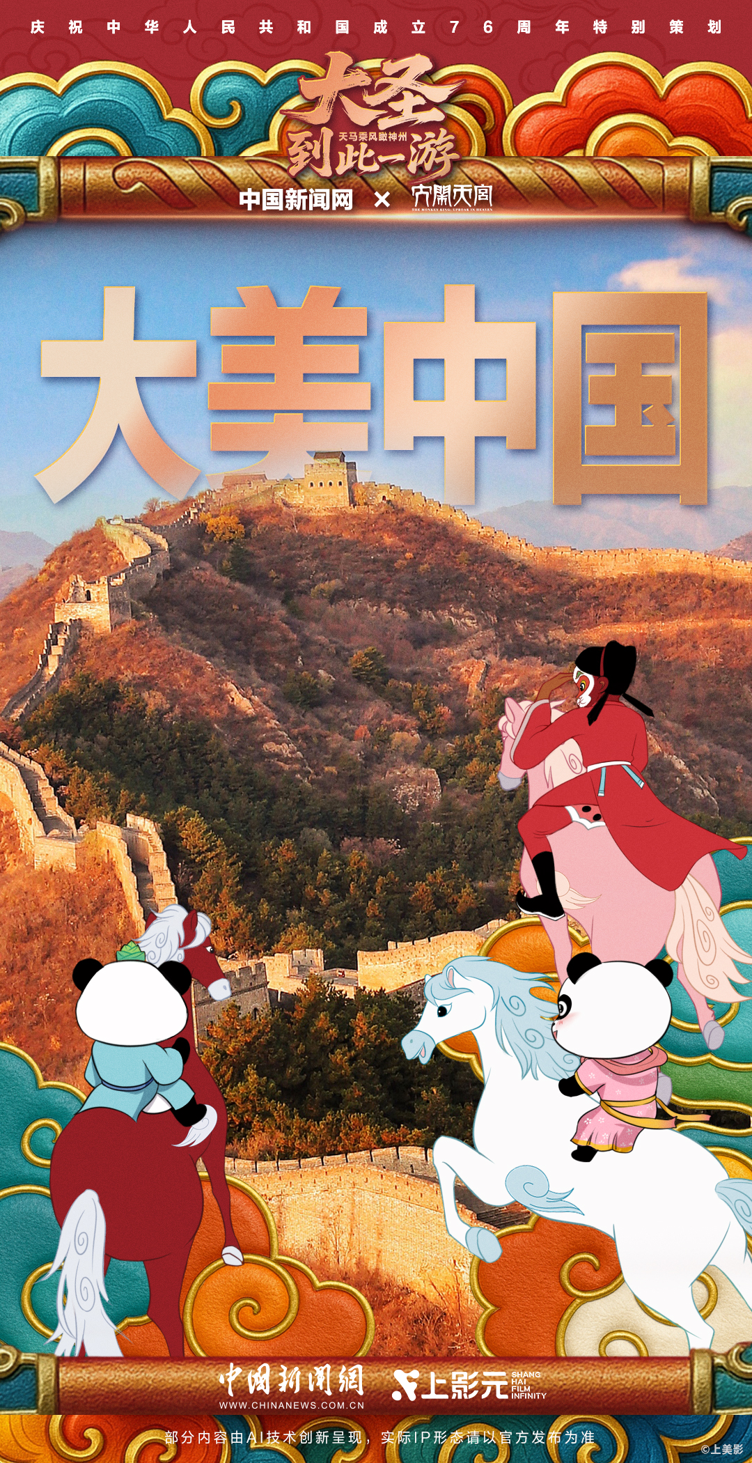 逾越时空的全天年夜圣孙悟空,骑着天马,再次动身!那1次,他带上了的年夜熊猫朋友——“启启”“心心”,一同穿梭江山湖海,挨卡年夜好华夏。 正在乱世华章里,尔们取年夜圣共游,瞧美丽中华,览绚丽江山。一同庆贺中华黎民同战邦创设76周年!